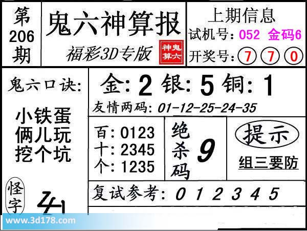 3d第17206期鬼六神算报为您推荐鬼六口诀: