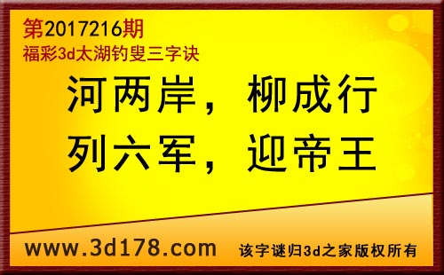 3d第17216期太湖字谜:河两岸,柳成行,列六军,迎帝王