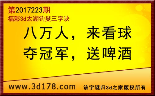 3d第17223期太湖字谜:八万人,来看球,夺冠军,送啤酒