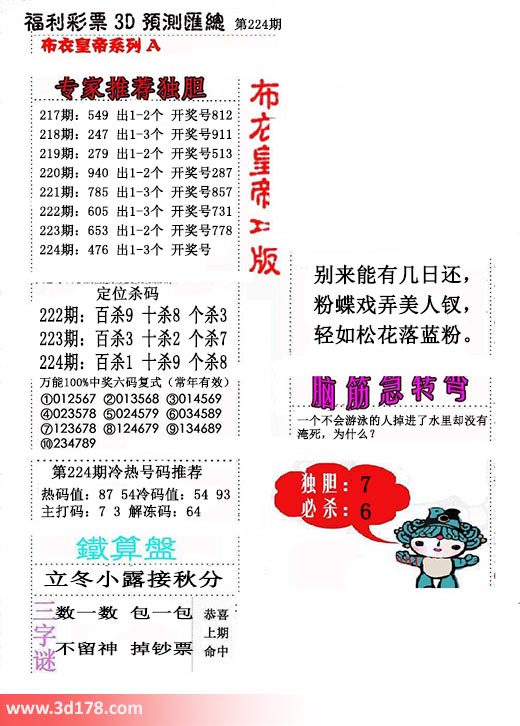 福彩3d第2017224期布衣皇帝A版布衣专家独家推荐: