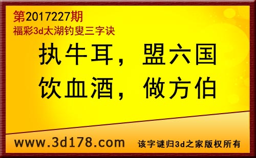 3d第17227期太湖字谜:执牛耳,盟六国,饮血酒,做方伯