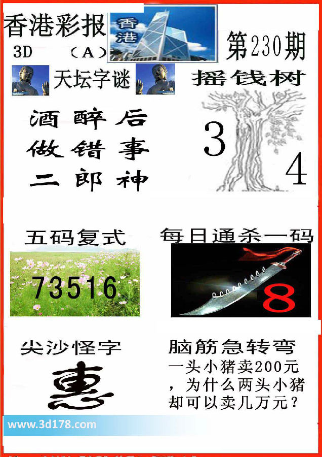 天坛字谜:酒醉后,做错事,二郎神摇钱树:3 4五码复式:13567每日通杀一码:8脑筋急转筋:一头小猪唛200元,为什么两头小猪却可以卖几万元?