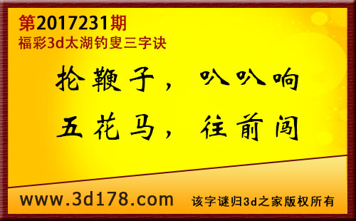 3d第17231期太湖字谜:抡鞭子,叭叭响,五花马,往前闯
