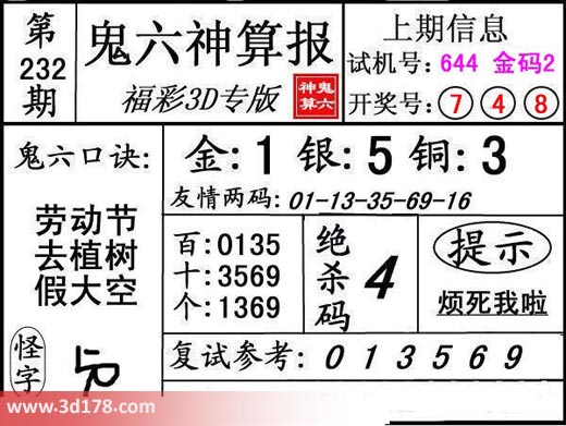 3d第17232期鬼六神算报为您推荐鬼六口诀: