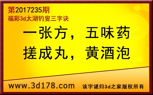 3d第17235期太湖字谜:一张方,五味药,搓成丸,黄酒泡