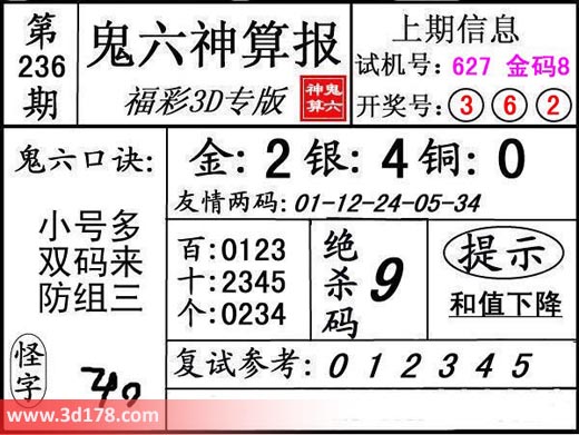 3d第17236期鬼六神算报为您推荐鬼六口诀: