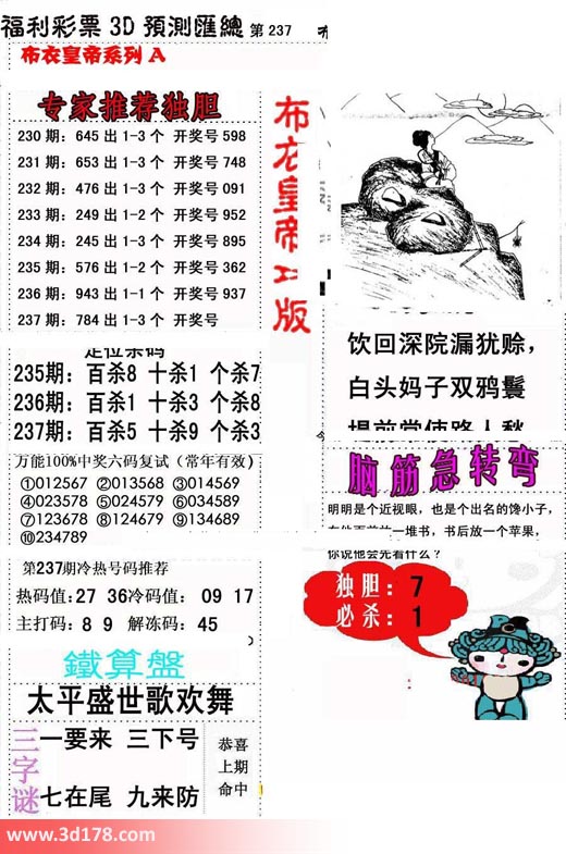 福彩3d第2017237期布衣皇帝A版布衣专家独家推荐: