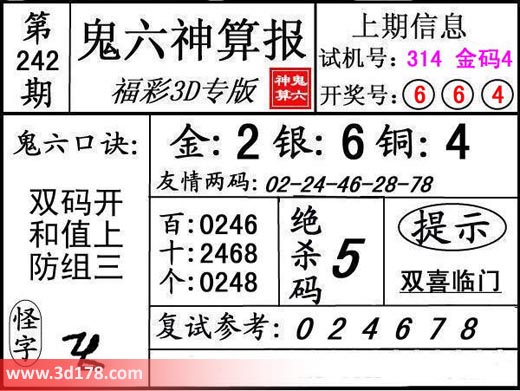 3d第17242期鬼六神算报为您推荐鬼六口诀: