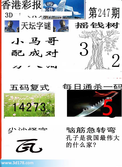 3d香港彩报第17247期摇钱树:本期3d香港彩报图详情如下:天坛字谜:小马哥,配成对,男人泪摇钱树:3 2五码复式:12347每日通杀一码:5脑筋急转筋:孔子是我国最伟大的什么家?该香港彩报由3d之家3d图库频道原创,仅供彩民参考,温馨提供。