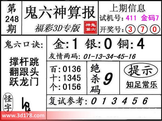 3d第17248期鬼六神算报为您推荐鬼六口诀: