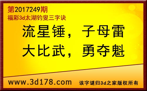 3d第17249期太湖字谜:流星锤,子母雷,大比武,勇夺魁