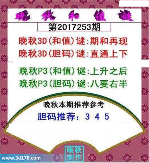 晚秋3D(和值)谜:期和再现晚秋3D(胆码)谜:直通上下晚秋p3(和值)谜:上升之后晚秋p3(胆码)谜:八要右半胆码推荐:345