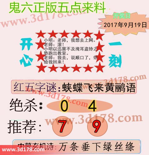 福彩3d第2017255期鬼六五点来料:3d鬼六五点来料详解第2017255期:红五字谜:蛱蝶飞来黄鹂语绝杀:0 4两胆码推荐:7 9内幕玄机诗:万条垂下绿丝绦该鬼六图库由3d之家3d图库频道原创,仅供彩民参考,温馨提供。