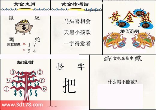 福彩第17255期3d黄金报黄金特码:3d之家第255期黄金报详解:黄金特码诗:马头喜相会,天黑小孩欢,一字得意者黄金生肖:鼠虎鸡蛇尾数推荐:单:1 7 双:2 4摇钱树推荐号码:391 206怪字:把幽默(玄机在其中):什么帽不能戴?黄金报图由3d之家3d图库频道原创,仅供彩民参考,温馨提供。