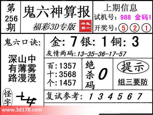 3d第17256期鬼六神算报为您推荐鬼六口诀:
