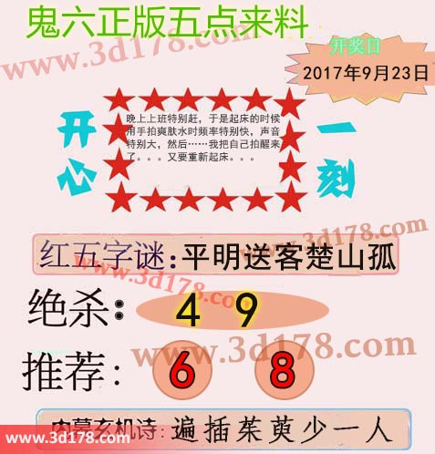 福彩3d第2017259期鬼六五点来料:3d鬼六五点来料详解第2017259期:红五字谜:平明送客楚山孤绝杀:4 9两胆码推荐:6 8内幕玄机诗:遍插茱萸少一人该鬼六图库由3d之家3d图库频道原创,仅供彩民参考,温馨提供。