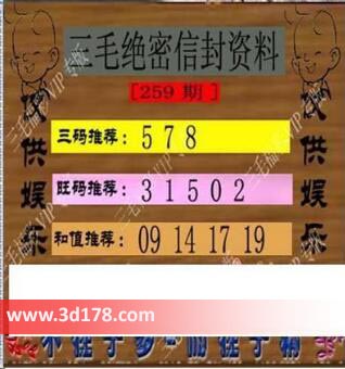 3d之家第2017259期三毛绝密信封资料图:福彩3d第259期三毛绝密信封资料图详解:三码推荐:578旺码推荐:01235和值推荐:09 14 17 19该三毛图库由3d之家3d图库频道原创,仅供彩民参考,温馨提供。