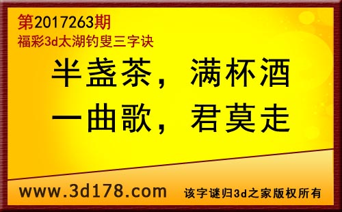 3d第17263期太湖字谜:半盏茶,满杯酒,一曲歌,君莫走