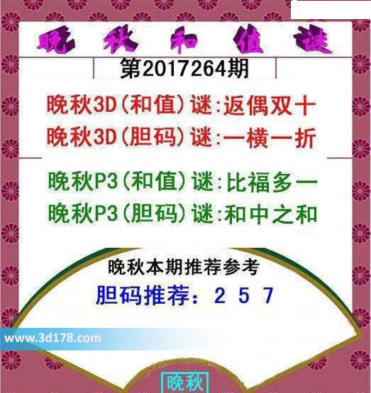 晚秋p3(和值)谜:比福多一