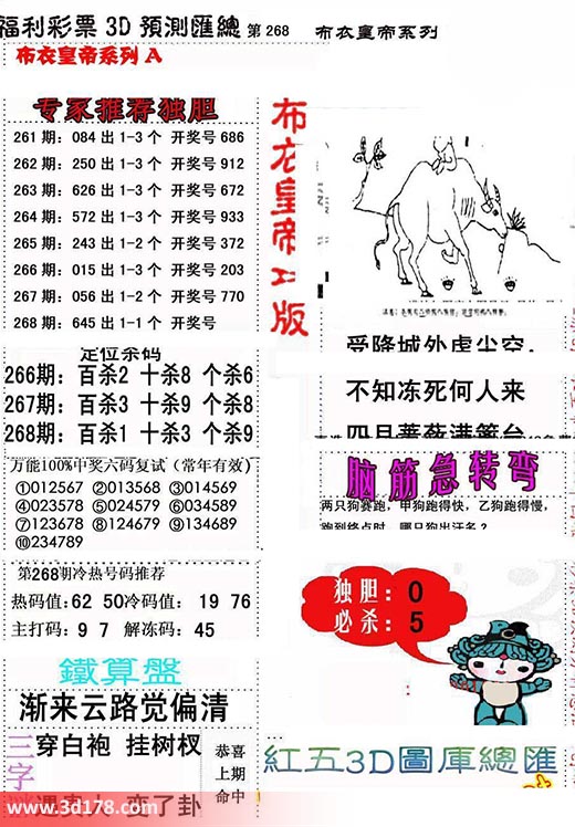 福彩3d第2017268期布衣皇帝A版布衣专家独家推荐:3d之家布衣皇帝第268期详解:268期:645 出1-3个 开奖号定位杀码:百位杀1 十位杀3 个位杀9第268期冷热号码推荐:热码值:62 50冷码值:19 76主打码:9 7解冻码:45天机诗:受降城外虏尘空不知冻死何人来四月蔷薇满蓠台铁算盘:渐来云路觉偏清三字谜:穿百袍,挂树杈,遇贵人,变了卦该布衣图库由3d之家3d图库频道原创,仅供彩民参考,温馨提供。