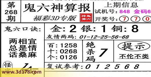 3d第17268期鬼六神算报为您推荐鬼六口诀:本期3d鬼六图库精解如下:复式参考:012568金胆:2,银胆:1,铜胆:8定位复式:百位:1258十位:0268个位:01236绝杀码:7友情两码01-12-25-56-68该鬼六图库由3d之家3d图库频道原创,仅供彩民参考,温馨提供。