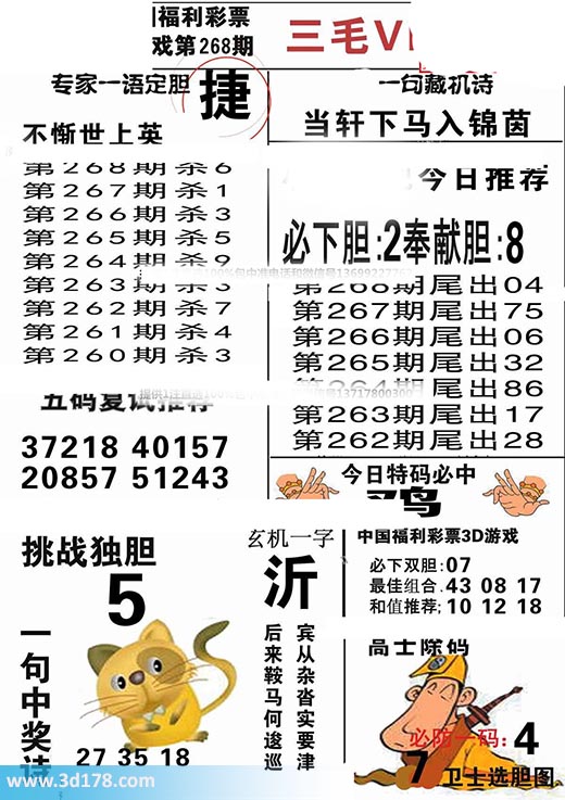 福彩3d第2017268期三毛VIP:3d第2017268期三毛VIP详解:一句藏机诗:当轩下马入锦茵第2017268期挑战独胆:5必下胆:2 奉献胆:8五码复式推荐:37218 40157 20857 51243今日特码必中:鸡最佳组合:43 08 17和值推荐:10 12 18玄机一字:沂一句中奖诗:宾从杂沓实要津,后来鞍马何逡巡该三毛玄机解码图由3d之家3d图库频道原创,仅供彩民参考,温馨提供。