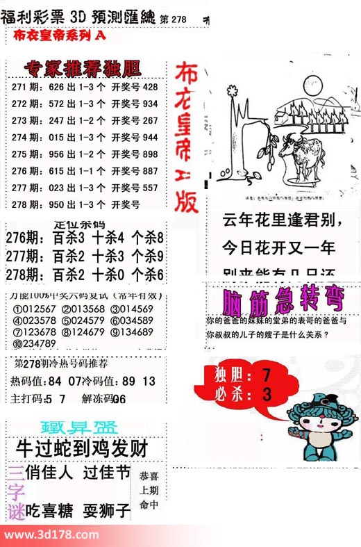 福彩3d第2017278期布衣皇帝A版布衣专家独家推荐: