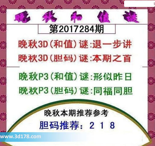 晚秋p3(胆码)谜:同福同胆