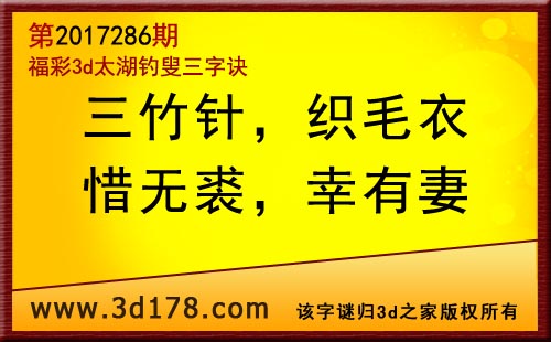 3d第17286期太湖字谜:三竹针,织毛衣,惜无裘,幸有妻