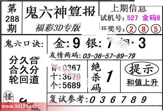 3d第17288期鬼六神算报为您推荐鬼六口诀: