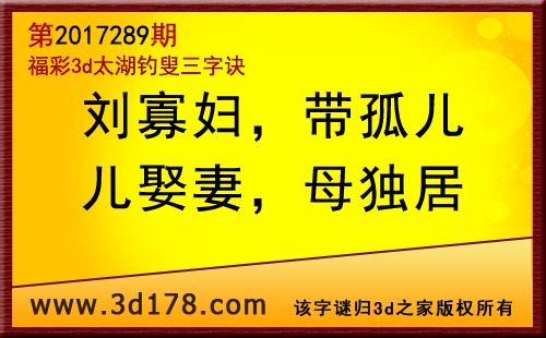 3d第17289期太湖字谜:刘寡妇,带孤儿,儿娶妻,母独居