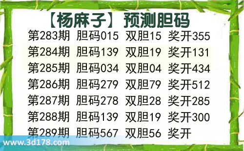 福彩3d第2017289期杨麻子胆码图:3d第2017289期杨麻子胆码推荐:第283期 胆码015 双胆15 奖开355第284期 胆码139 双胆19 奖开131第285期 胆码034 双胆04 奖开434第286期 胆码279 双胆79 奖开512第287期 胆码278 双胆28 奖开285第288期 胆码139 双胆19 奖开300第289期 胆码567 双胆56 奖开杨麻子图库由3d之家3d图库频道原创,仅供彩民参考,温馨提供。