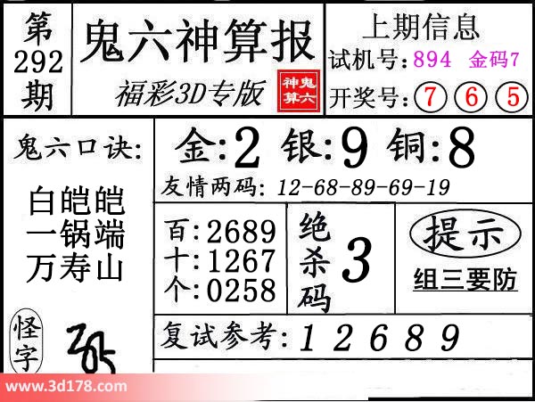 3d第17292期鬼六神算报为您推荐鬼六口诀:本期3d鬼六图库精解如下:复式参考:12689金胆:2,银胆:9,铜胆:8定位复式:百位:2689十位:1267个位:0258绝杀码:3友情两码:12-68-89-69-19该鬼六图库由3d之家3d图库频道原创,仅供彩民参考,温馨提供。