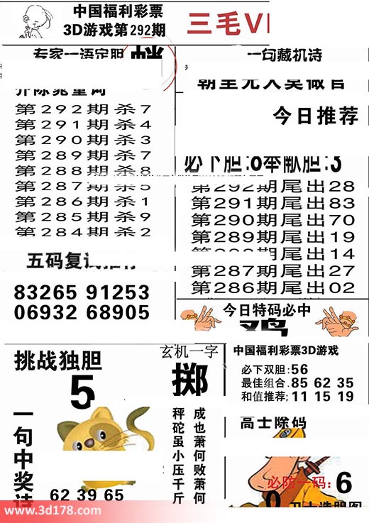 福彩3d第2017292期三毛VIP:3d第2017292期三毛VIP详解:一句藏机诗:朝里无人莫做官第2017292期挑战独胆:5必下胆:8 奉献胆:3五码复式推荐:83265 91253 06832 68905今日特码必中:鸡最佳组合:85 62 35和值推荐:11 15 19玄机一字:掷一句中奖诗:成也萧何败也萧何,秤砣虽小压千斤该三毛玄机解码图由3d之家3d图库频道原创,仅供彩民参考,温馨提供。