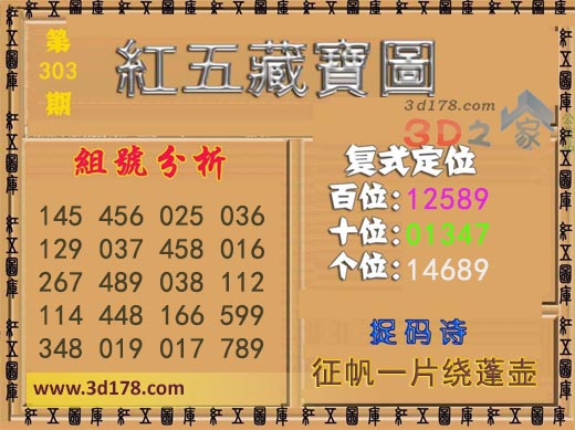 红五藏宝图3d第2017303期:福彩3d第2017303期红五藏宝图:复式定位:百位:12589十位:01347个位:14689捉码诗:征帆一片绕蓬壶组号分析:145 456 025 036 129 037 458 016 267 489 038 112 114 448 166 599 348 019 017 789红五图库由3d之家3d图库频道原创,仅供彩民参考,温馨提供。