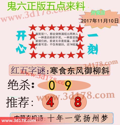 福彩3d第2017307期鬼六五点来料:3d鬼六五点来料详解第2017307期:红五字谜:寒食东风御柳斜绝杀:0 9两胆码推荐:4 8内幕玄机诗:十年一觉扬州梦该鬼六图库由3d之家3d图库频道原创,仅供彩民参考,温馨提供。
