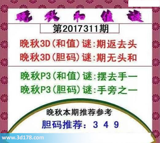 晚秋3D(和值)谜:期返去头