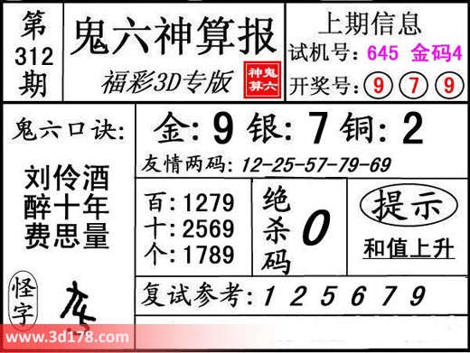 3d第17312期鬼六神算报为您推荐鬼六口诀: