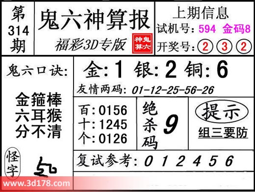 3d第17314期鬼六神算报为您推荐鬼六口诀: