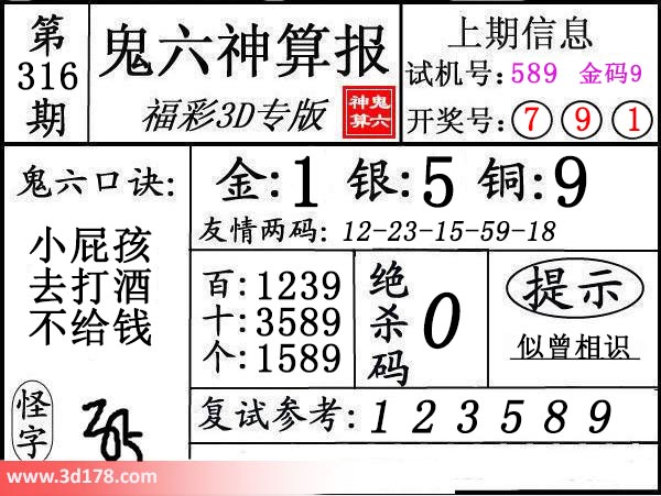 3d第17316期鬼六神算报为您推荐鬼六口诀: