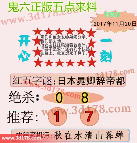 福彩3d第2017317期鬼六五点来料:3d鬼六五点来料详解第2017317期:红五字谜:日本晁卿辞帝都绝杀:0 8两胆码推荐:1 7内幕玄机诗:秋在水清山暮蝉该鬼六图库由3d之家3d图库频道原创,仅供彩民参考,温馨提供。