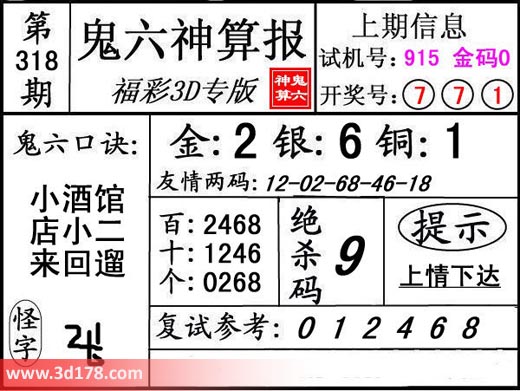 3d第17318期鬼六神算报为您推荐鬼六口诀: