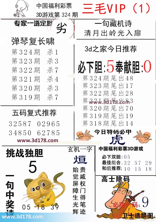 福彩3d第2017324期三毛VIP:3d第2017324期三毛VIP详解:一句藏机诗:清月出岭光入扉第2017324期挑战独胆:5必下胆:5 奉献胆:0五码复式推荐:32587 02965 34850 62785今日特码必中:虎最佳组合:32 57 29和值推荐:10 15 18玄机一字:烜一句中奖诗:贵戚权门得笔迹,始觉屏障生光辉该三毛玄机解码图由3d之家3d图库频道原创,仅供彩民参考,温馨提供。