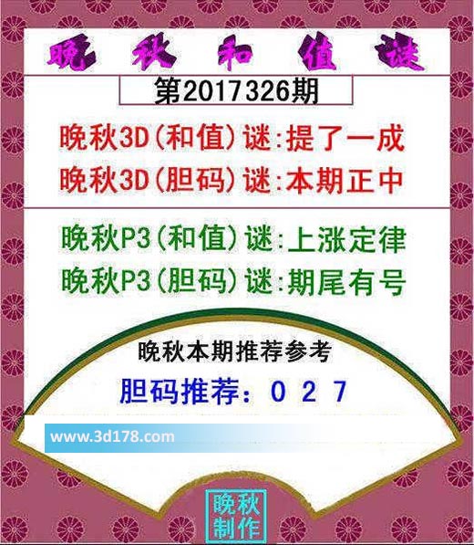 福彩3d红五晚秋图第17326期3d推荐:3d之家3d红五晚秋图第2017326期为您推荐分析:晚秋3D(和值)谜:提了一成晚秋3D(胆码)谜:本期正中晚秋p3(和值)谜:上涨定律晚秋p3(胆码)谜:期尾有号胆码推荐:027该红五图库由3d之家3d图库频道原创,仅供彩民参考,温馨提供。