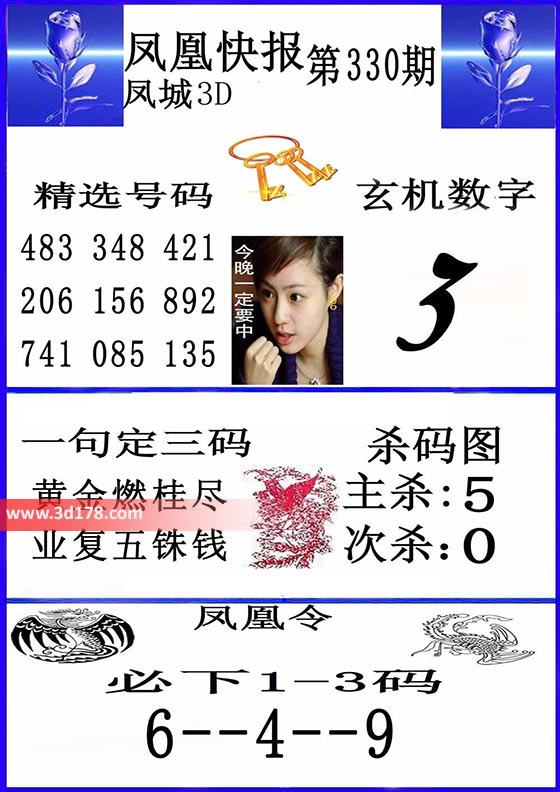 福彩3d凤凰快报图第17330期精选号码推荐: