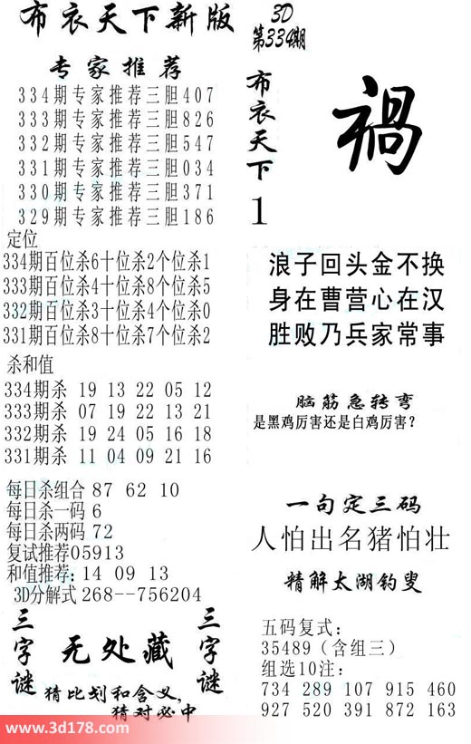 福彩3d第2017334期福彩3d布衣天下新版: