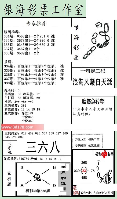 银海布衣图3d第2017338期布衣专家为您精心推荐:3d第2017338期银海布衣图详解:号码推荐:338期:3689 出1--2个三位杀码:338期:百位杀0 十位杀1 个位杀5推荐:3** *8* **9和值推荐:12 14 15 18复式推荐:百位379 十位046 个位369三字谜:三六八一句定三码:浪淘风簸自天涯脑筋急转弯:什么事每人每天都必须认真的做?该布衣图库由3d之家3d图库频道原创,仅供彩民参考,温馨提供。