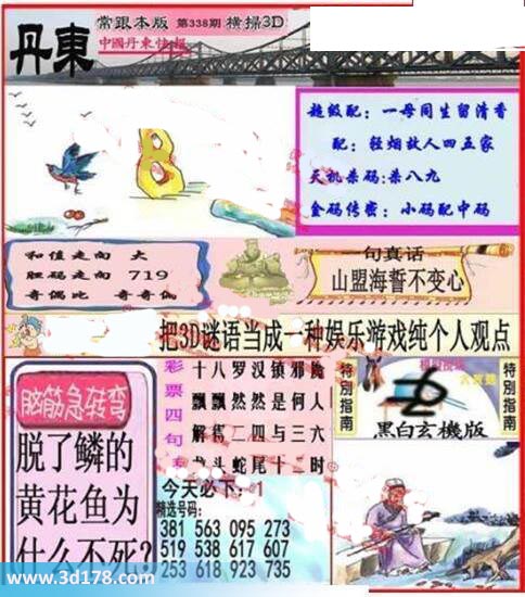3d之家第2017338期丹东快报图:3d第2017338期丹东快报图详解:天机杀码:杀八九和值走向:大胆码走向:719奇偶比:2:1金码传密:小码配中码精选号码:381 563 095 273 519 538 617 607 253 618 923 735脑筋急转弯:脱了鳞的黄花鱼为什么不死该丹东图库由3d之家3d图库频道原创,仅供彩民参考,温馨提供。