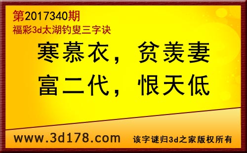 3d第17340期太湖字谜:寒慕衣,贫羡妻,富二代,恨天低