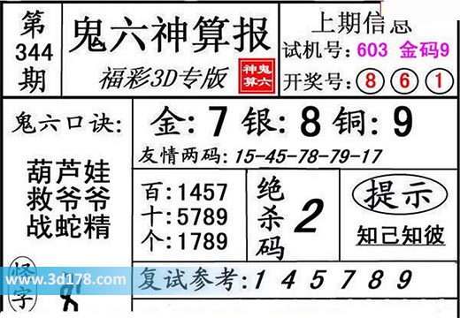 3d第17344期鬼六神算报为您推荐鬼六口诀: